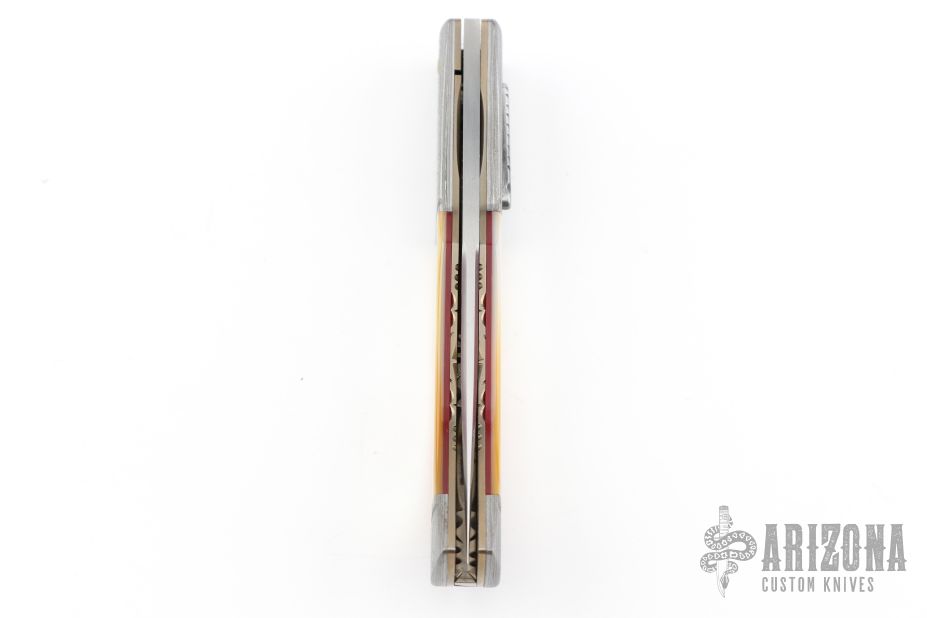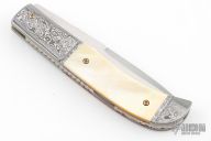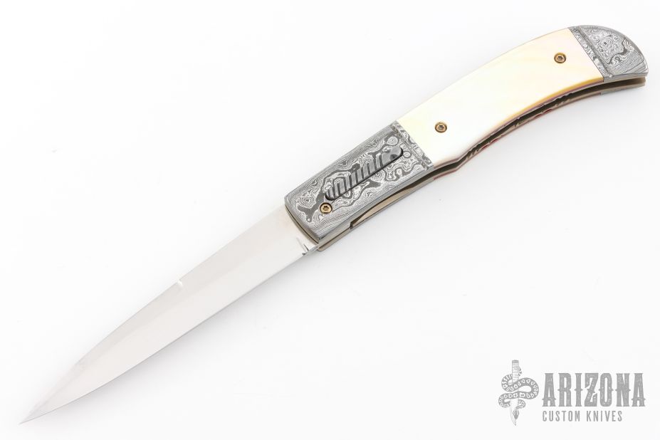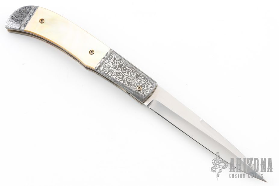This linerlock automatic by Chuck Gedraitis features a hand rub satin finished blade with false top edge. The handle has Damascus bolsters, fluted button, gold lip pearl scales, anodized and fileworked titanium liners, fileworked stainless steel backspacer with mother of pearl inlays. Nice detent, lockup and blade seating. Comes with COA. Excellent condition.