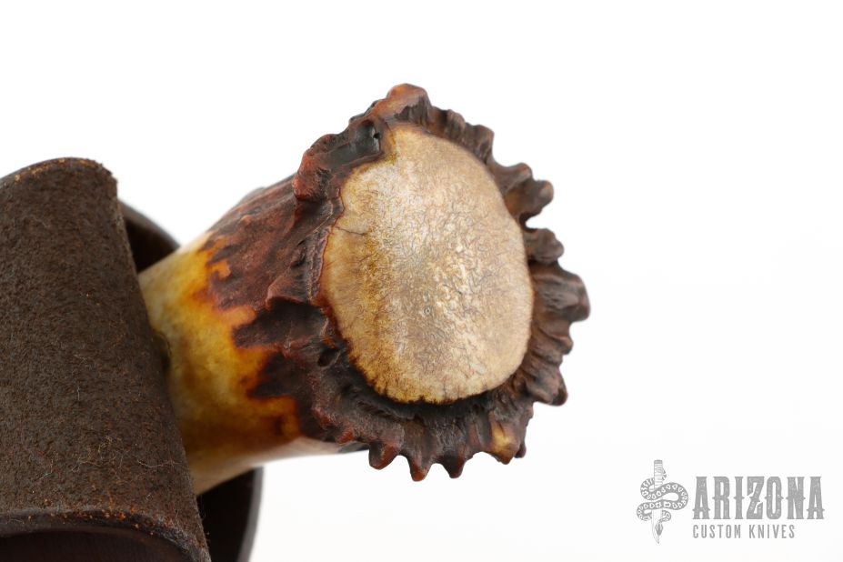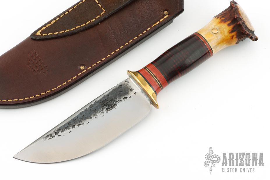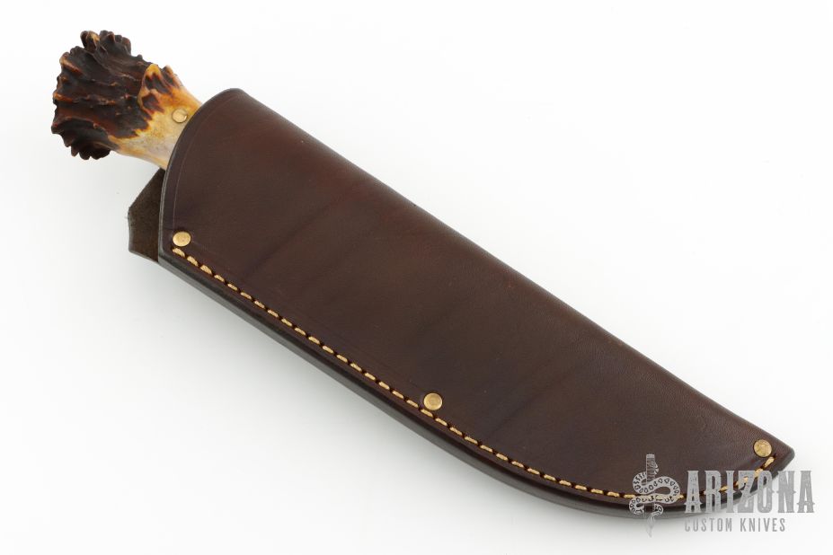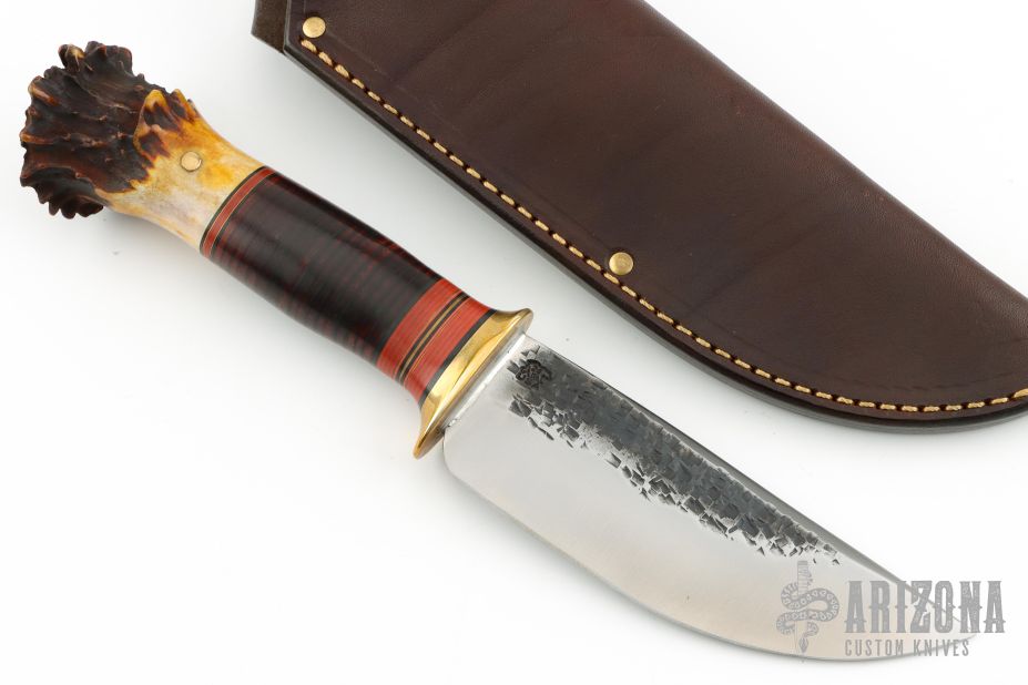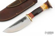 This Skinner by Jim Behring features a satin finished upswept hollow ground blade with false top edge, .185" blade stock and 1.575" blade depth, hidden tang construction. The handle features a brass guard, black/red/brass spacer pattern, horsehide stacked leather, crown stag pommel. Great look and feel. Comes with full stitch brown leather sheath and maker's zipper case. Has some patina, otherwise excellent condition.