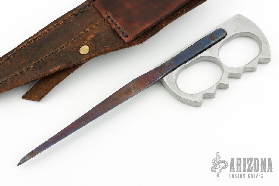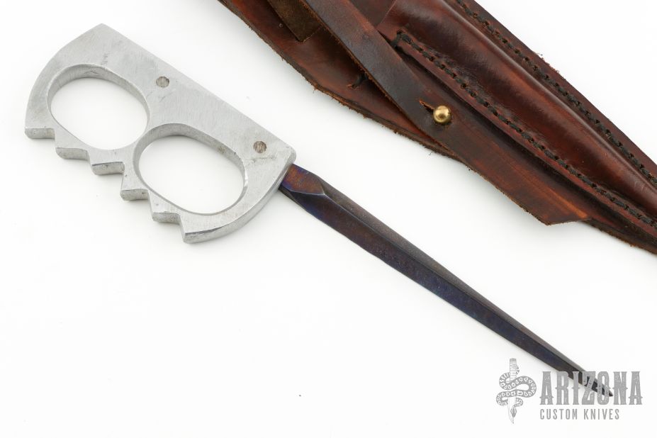 This Clements Trench Spike by Ploughshare Forge features a black triangle dagger blade that has been riveted to an aluminum knuckle grip. Comes with a brown leather sheath. Has temper colors on the blade. Has some scratches, but it is intended to look like the originals, otherwise good condition.