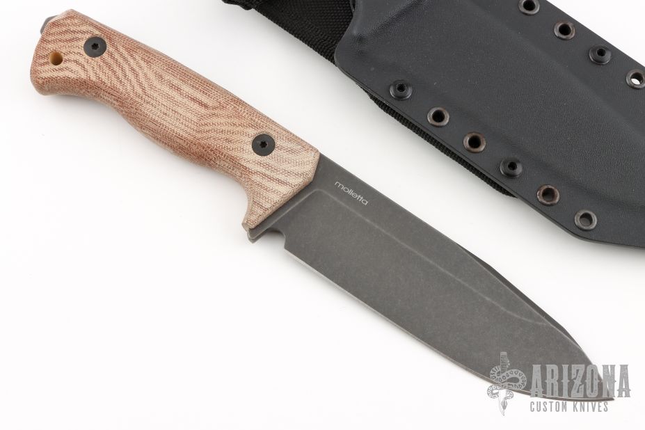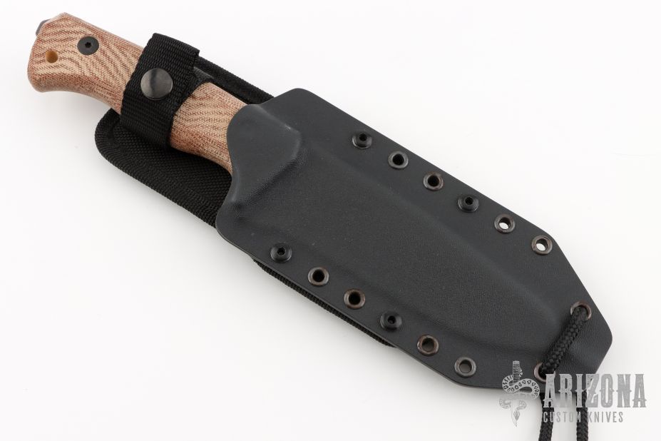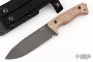 This T6 by Lion Steel features an acid/tumble finished drop point blade with .213" blade stock and 1.762" blade depth. The handle is comprised of a machined linen micarta that wraps around the full tang construction. Lanyard hole and exposed tang glass breaker in pommel. Includes a kydex sheath with belt loop. Has a couple light scuffs, otherwise Excellent condition.