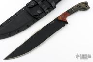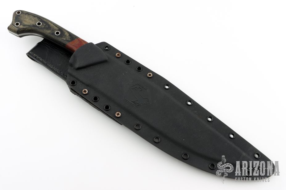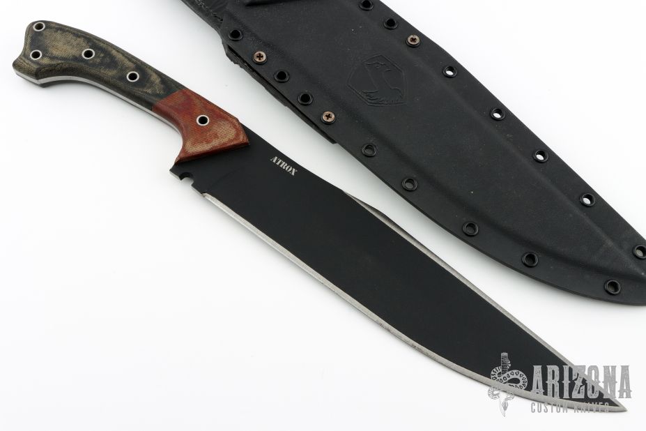 The name translates to terrible in Latin. Terrible indeed, as the Atrox Knife sports an 11” blade with a clip point that is a combination fighting survival tool that works double as a machete or a self-defense weapon. Dual Micarta gives it an interesting look, but don’t get fooled by aesthetics, it’s ready to do ugly work right away. Comes with original kydex and leather sheath. Excellent condition.