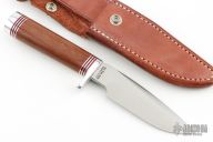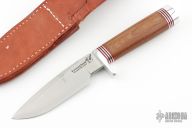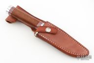 This Classic Blades Woodsman from Blackjack Knives features a drop point satin finished blade with .214" blade stock and 1.257" blade depth, hidden tang construction. The handle is comprised of aluminum single guard with red white and black spacers, micarta handle, aluminum pommel with brass fitting. Lanyard hole. Includes leather sheath with belt loop. Has scuffs, great condition otherwise.