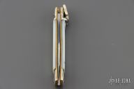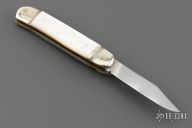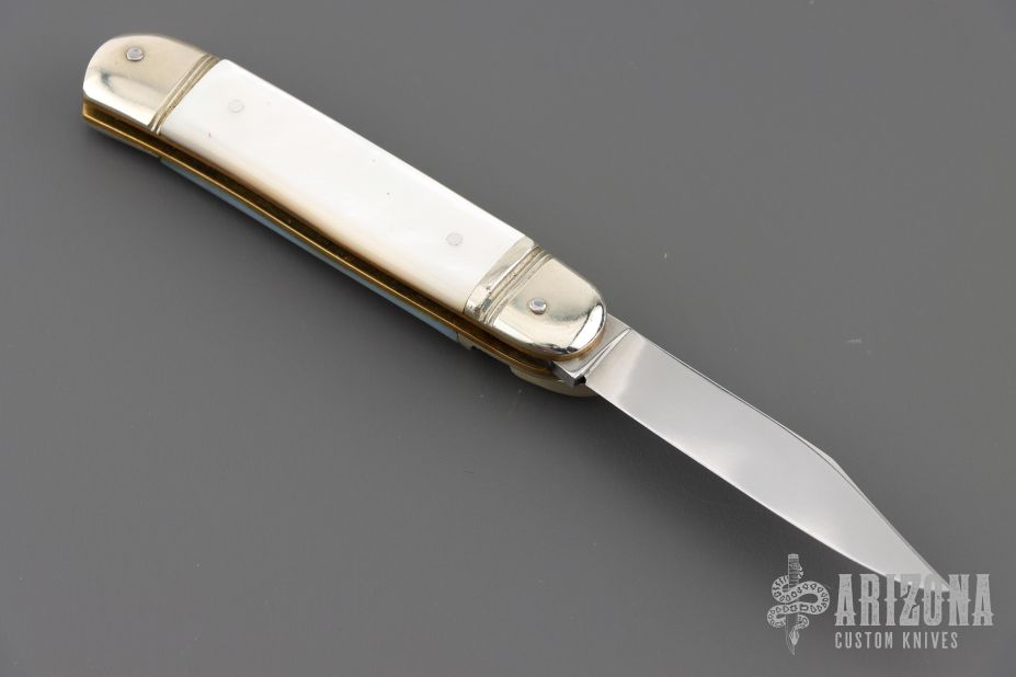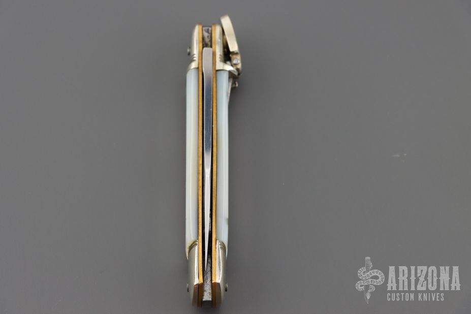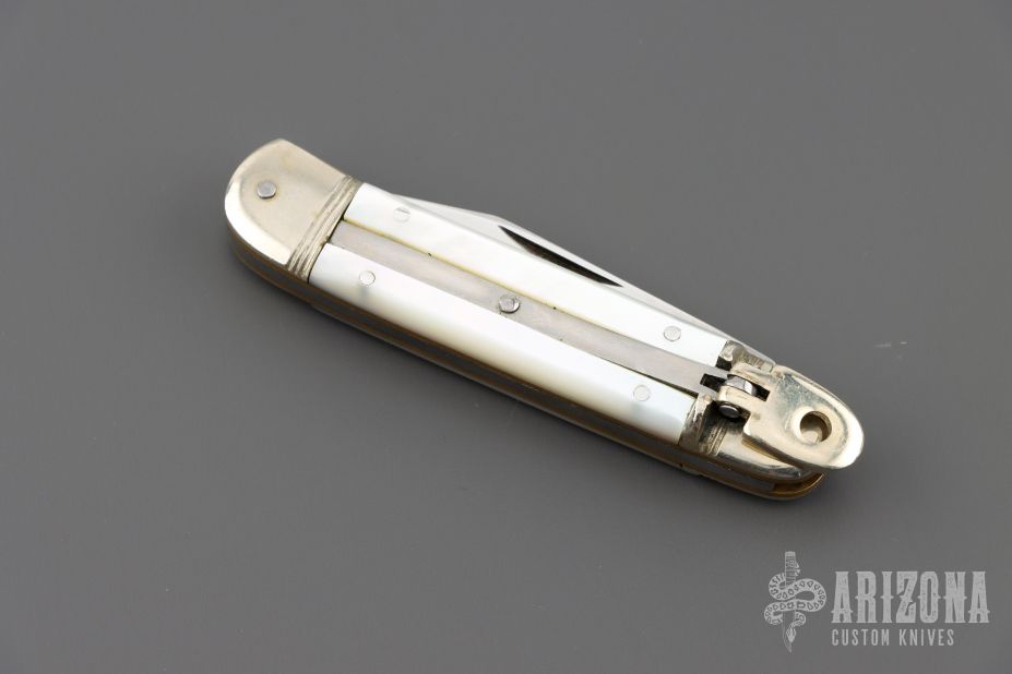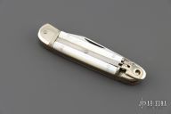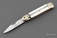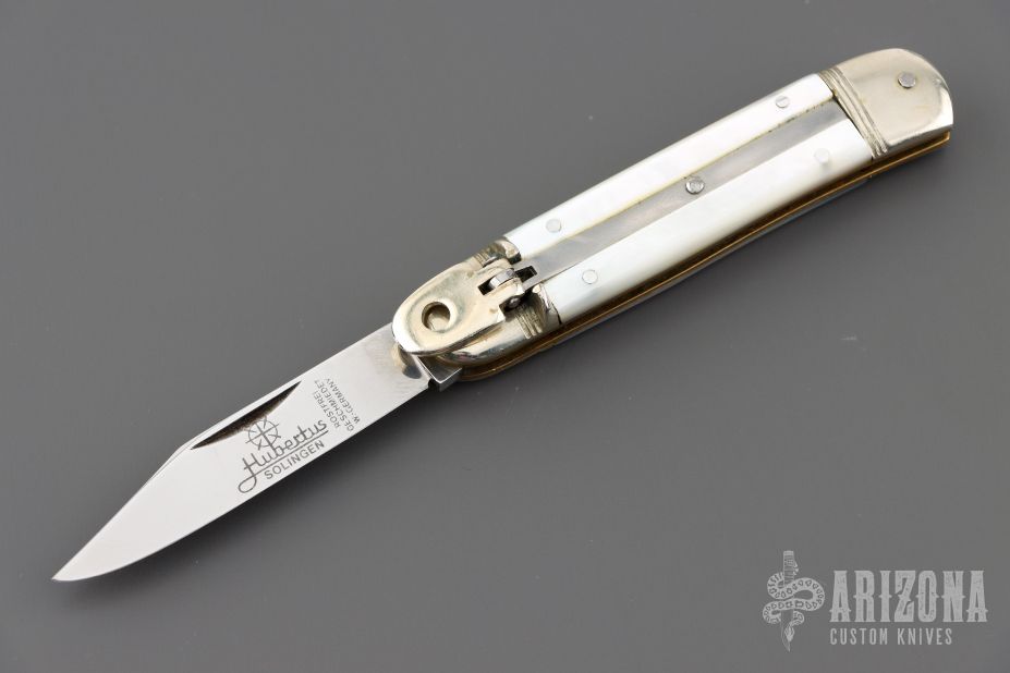 This leverlock auto by Hubertus features a mirror polished blade, nickel silver double bolsters, mother of pearl scales, brass liners and pins. Opens with a nice snap. Very fast opening. Has light scratches, otherwise good condition.