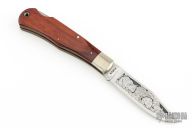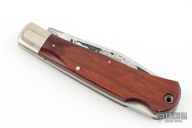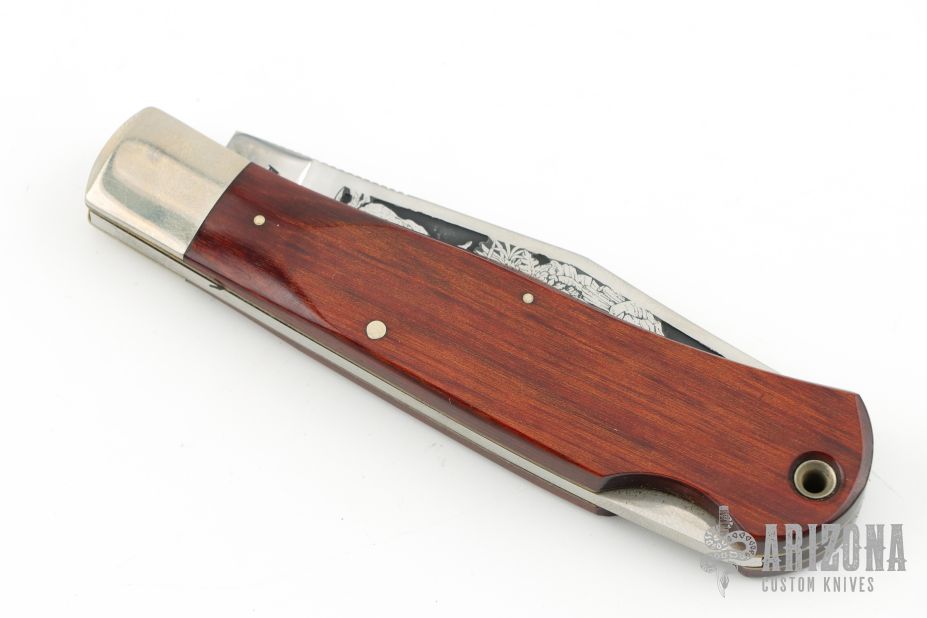 This Lockback by Aurum features a satin finished blade with nail nick and a notched thumbrest. The handle has nickel silver bolsters, dymondwood scales, brass liners and stainless steel backspacer. Has some light scratches, otherwise good condition.