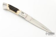 This thumbprint dagger by Herman J Schneider has a hand rubbed satin finished double edged blade with .235" blade stock and 1.067" blade depth, full tapered tang construction. Stainless steel dovetailed bolsters that have a "thumprint" design for comfort and grip. The scales are excellently matched stag. This dagger is incredibly crafted with nice finish work and gorgeous grinds. Excellent condition.