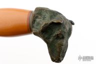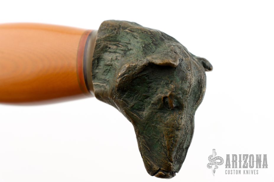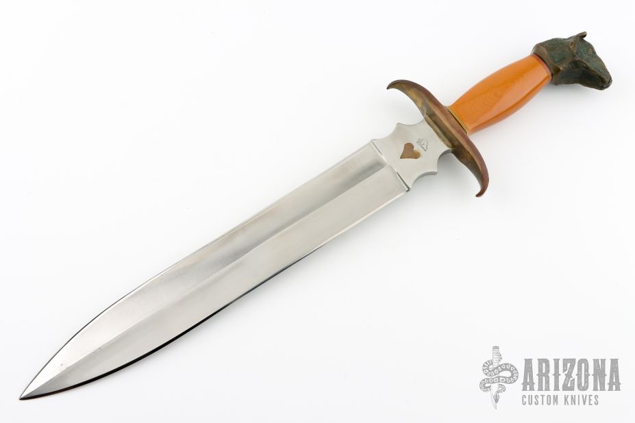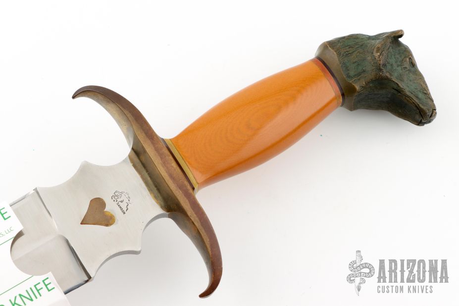 This Large Dagger by Jody Samson features a satin finished double edged blade with inlaid brass heart in the ricasso, .309" blade stock and 2.080" blade depth, hidden tang construction. The handle has brass guard and bear head butt with a yellow paper micarta grip with black and brass spacers. Has some light scratches and patina, otherwise excellent condition for its age.