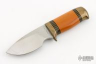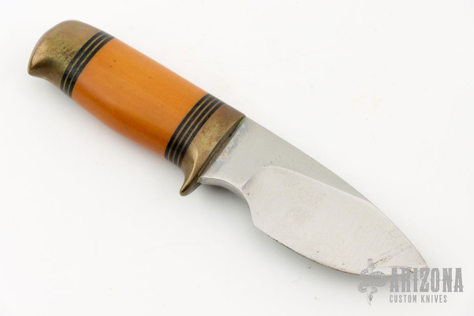This knife by Victor Anselmo features a satin finished drop point blade with .134" blade stock and .923" blade depth, hidden tang construction. The handle has a brass guard and butt with yellow paper micarta grip, black/brass spacers. Has a couple light scratches, otherwise excellent condition.