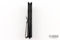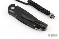 This TR-5 automatic model has a black anodized aluminum handle with a Bruce Shaw designed sterling skull inlay, black lip pearl push button, and a deep carry tip-up pocket clip. Its blade is made from CPM-S35VN stainless steel in a black DLC coated finish. A sliding safety lock allows secure pocket carry and prevents accidental blade deployment.