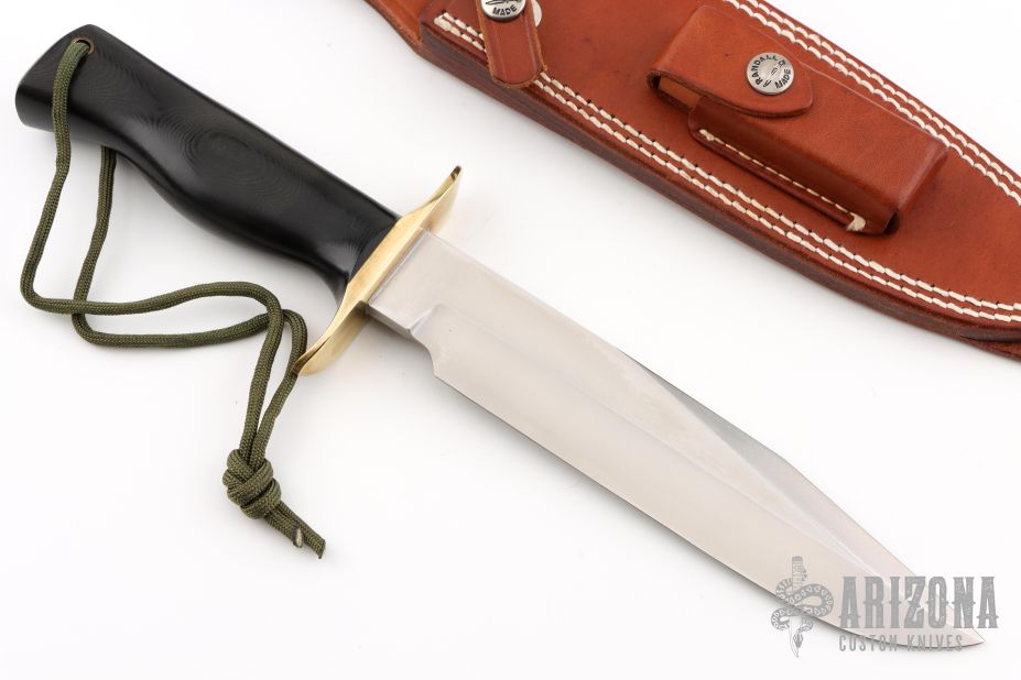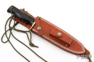 This Model 14 from Randall Made Knives features a satin finished blade with sharpened top edge, .237" blade stock and 1.396" blade depth, full tang construction. The handle is comprised of a brass guard and black linen micarta handle. Comes with brown leather sheath and stone. Excellent condition.