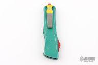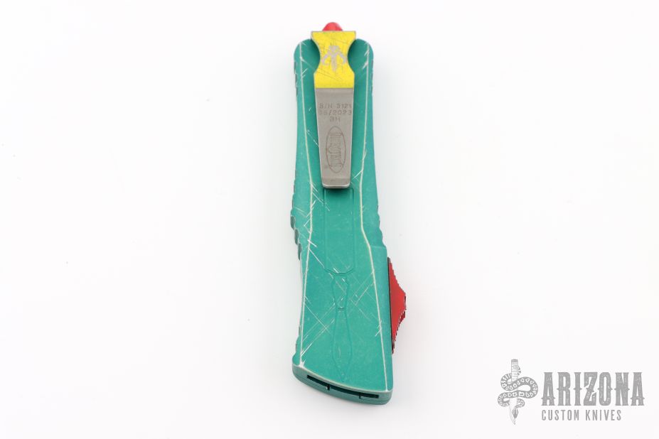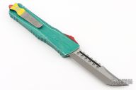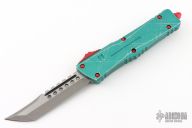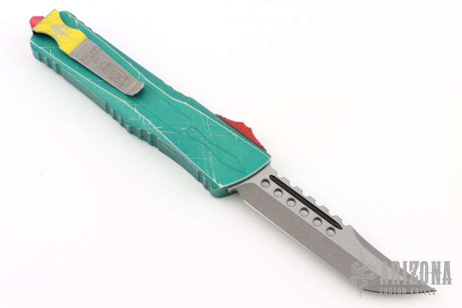 This Combat Troodon Bounty Hunter by Microtech Knives features a Hellhound tanto blade with fullers, satin flats and apocalyptic finished grinds. The handle has a green battle worn aluminum handle with red hardware, tip down apocalyptic finished stainless steel clip.  Includes the original box.  Excellent condition. Dated05/2023 s/n 3121.