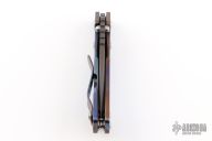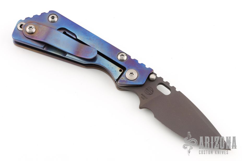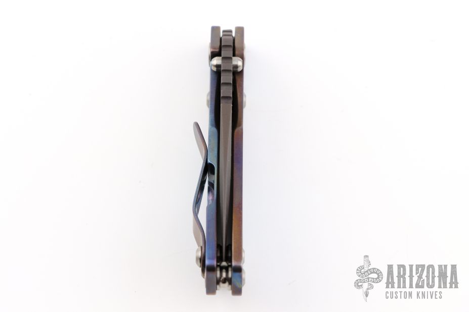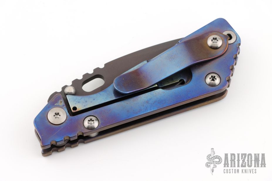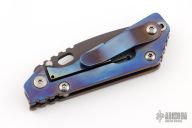 This PT by Mick Strider features a black blade with notched thumbrest and thumbhole. The handle has an orange peel finished and anodized titanium frame with matching tip up clip. New condition.
