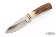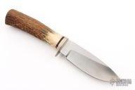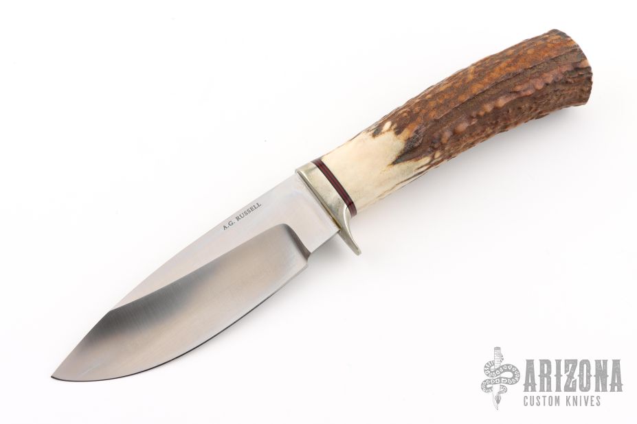 This A.G. Russell Special Hunter has a satin finished blade with .24" blade stock and 1.5" blade depth, hidden tang construction. The handle has a stag grip with nickel silver guard, and black/red spacers. Has some scuffs, excellent condition otherwise.