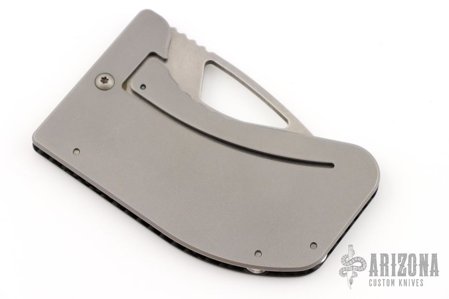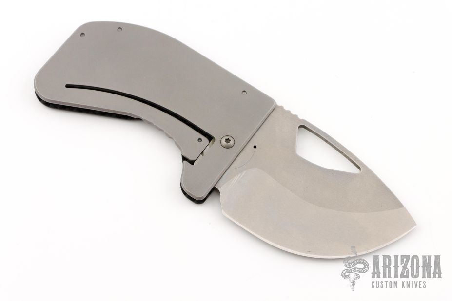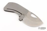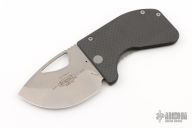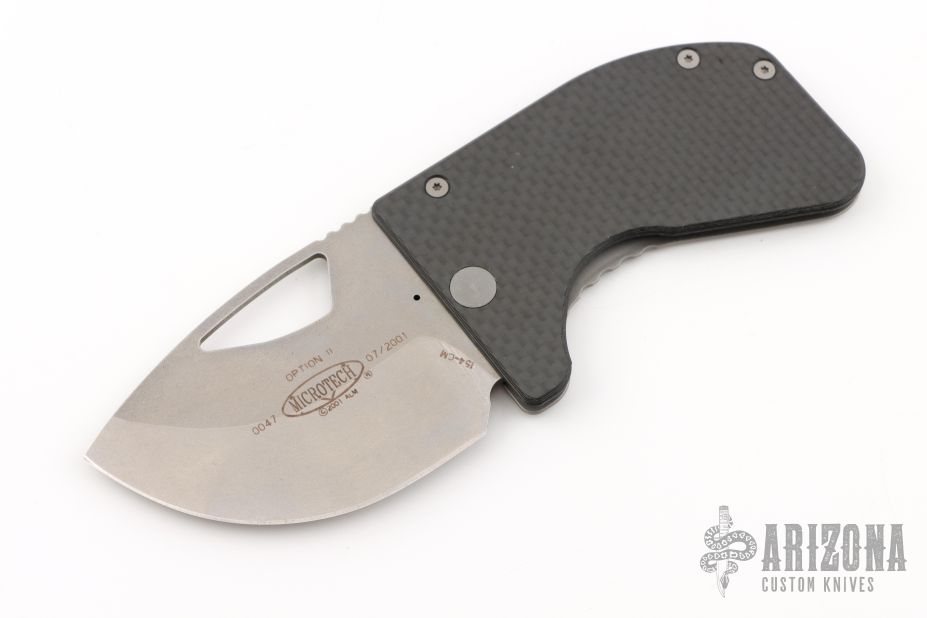 This Option II folder by Microtech features a stonewashed plain edge blade with notched thumbrest and a thumbhole. The handle is stainless steel with frame lock closure on one side and carbon fiber on the other. Dated 07/2001 and S/N 0047. Has some light scuffs, excellent condition otherwise. Comes with original box and papers.