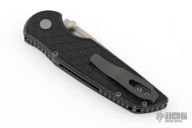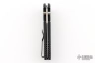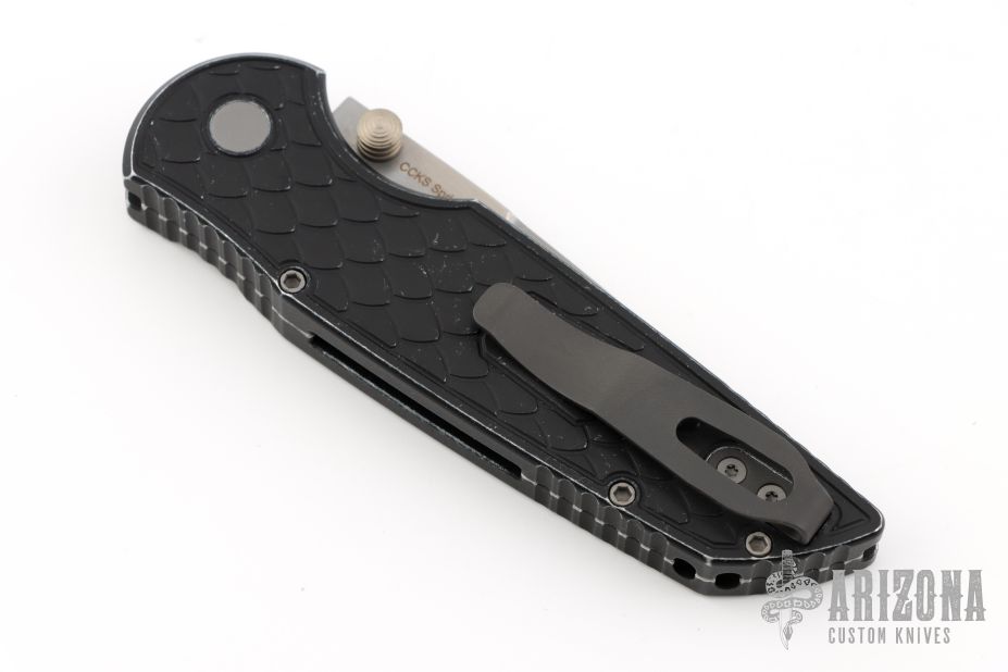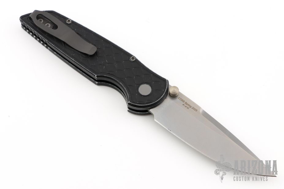 This Integrity Folder is a well made knife with great fit and finish, just what you expect from Pro-Tech. This Integrity folding knife features a S35-VN stainless steel blade with stonewashed finish, a very nice touch. The handle has a Black Battleworn "Reptile" textured aluminum handle with gold lip pearl button and tip up black stainless steel clip. Comes with original box and paper. New from maker at the 2025 CCKS Spring Show.