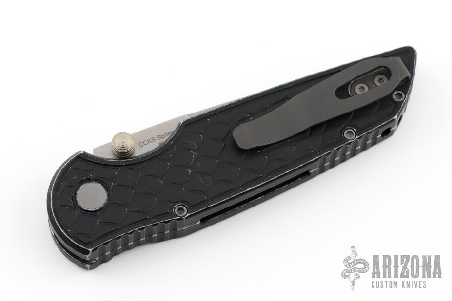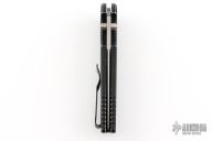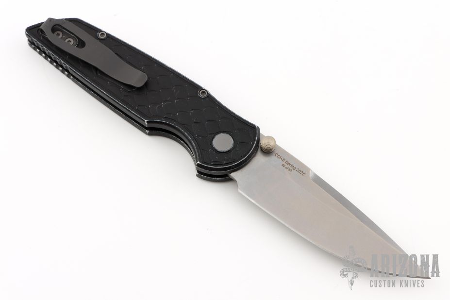 This Integrity Folder is a well made knife with great fit and finish, just what you expect from Pro-Tech. This Integrity folding knife features a S35-VN stainless steel blade with stonewashed finish, a very nice touch. The handle has a Black Battleworn "Reptile" textured aluminum handle with gold lip pearl button and tip up black stainless steel clip. Comes with original box and paper. New from maker at the 2025 CCKS Spring Show.