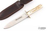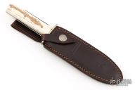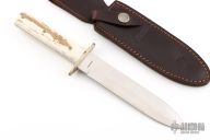 This knife features a drop point blade with swedge, .143"blade stock, 1.11"blade depth, and full tang construction. The handle features a nickel silver guard, pinned stag grip, and nickel silver escutcheon. Comes with original leather sheath. Has some scuffs and scratches, great condition otherwise.