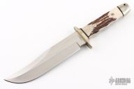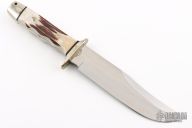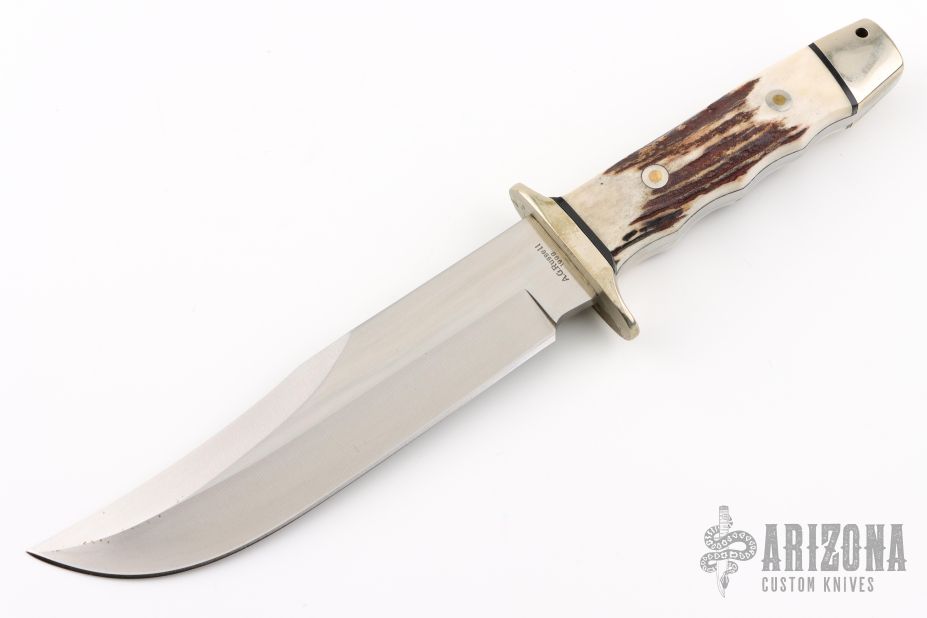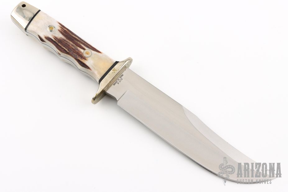 This bowie from A.G. Russell features a satin finished blade with a false top edge, .215" blade stock and 1.531" blade depth, full tang construction. The handle has nickel silver guard and butt, and stag scales with black spacers. Dated 1999. Has some light scratches, and patina, great condition otherwise. Also has some discoloration on the guard.