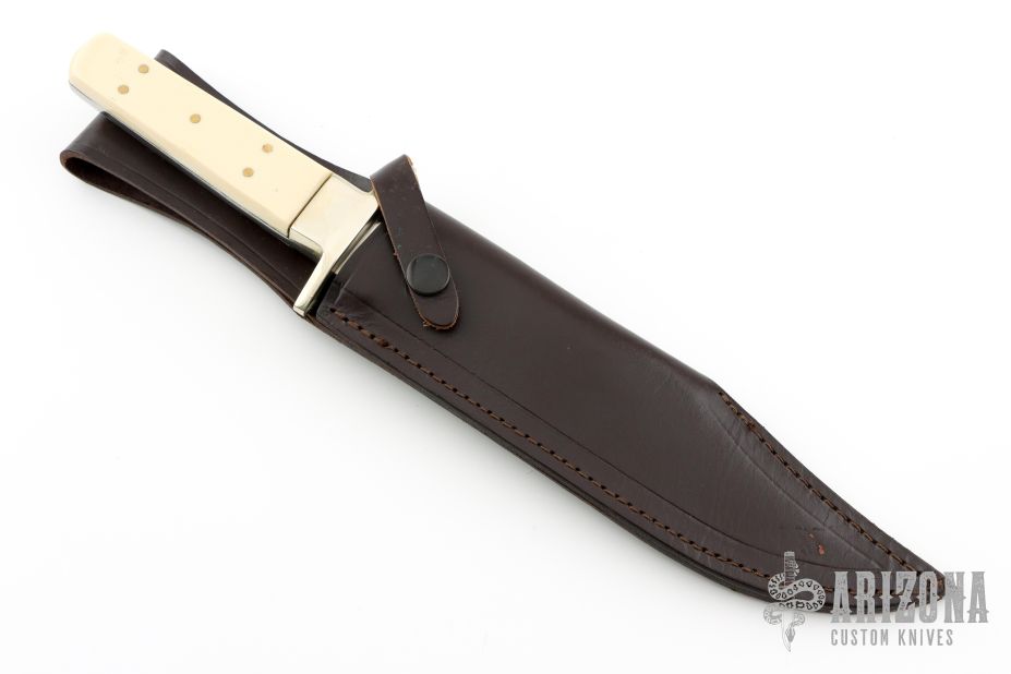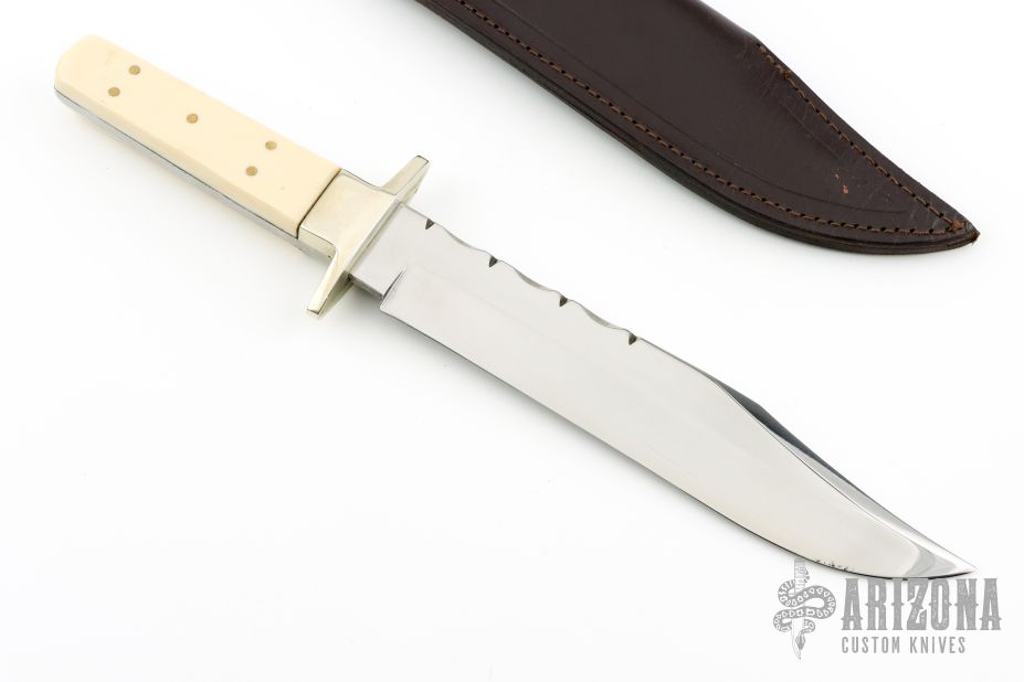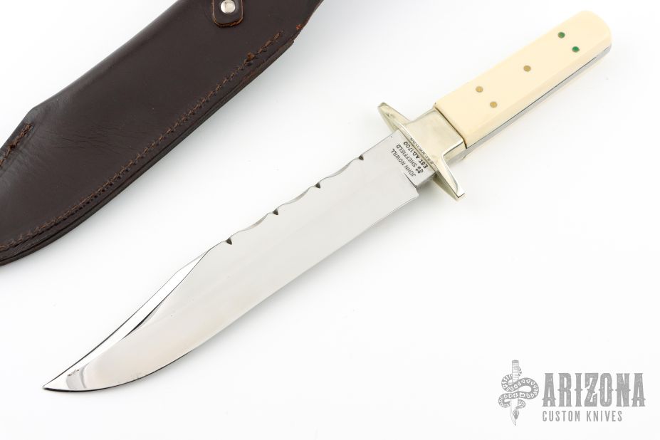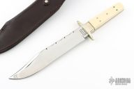 This Bowie from John Nowill features a satin polished clip point blade with sharpened top edge, .243" blade stock and 1.398" blade depth, full tang construction. The handle has a nickel silver guard with brass pins and bone covers. Includes a custom brown leather sheath with belt loop. Has scuffs, scratches, and patina. Great condition otherwise.