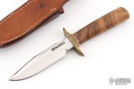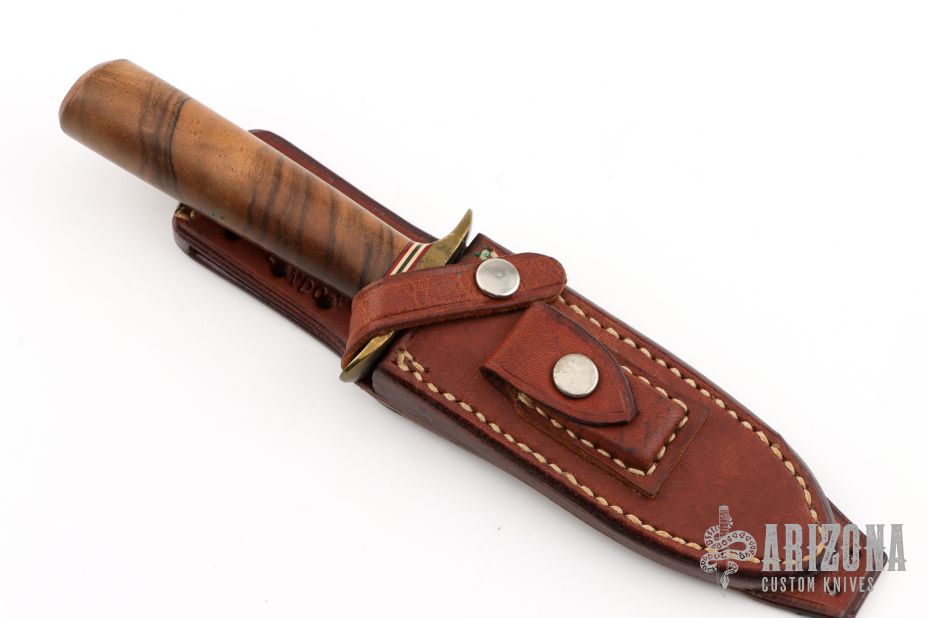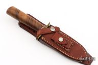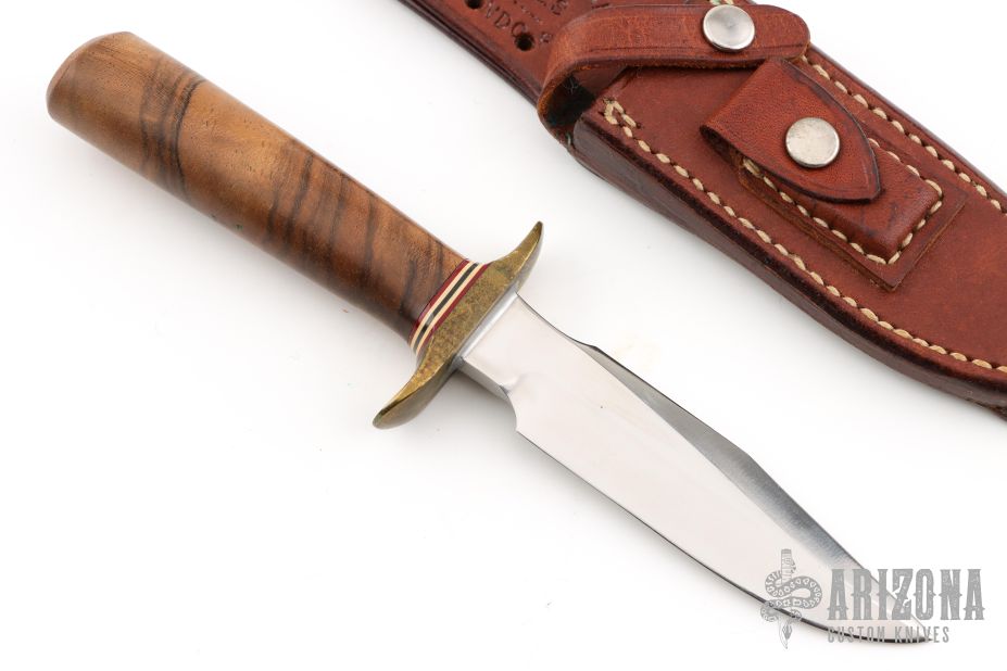 This is a miniature Model 1 - with all the features of the famous WWII full size Model 1. Stainless steel blade with top edge sharpened approximately 1 3/4 inches back from the tip, .165" blade stock and .825" blade depth, hidden tang construction. The handle has a brass double guard, walnut grip with red/white/blue spacers. Comes with a Johnson Roughback brown leather sheath. Excellent condition. Comes with a Randall zippered case.