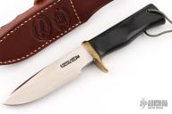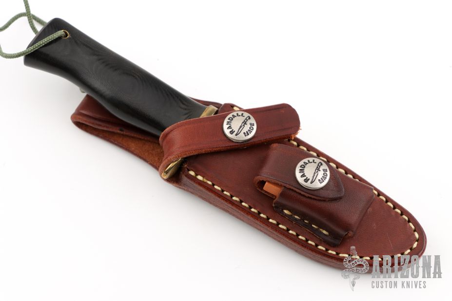 This Miniature model 28 by Randall Made Knives features a satin finished drop point blade with notched thumbrest, .183" blade stock and .915" blade depth, full tang construction. The handle has a brass guard, black micarta grip and lanyard hole. Each miniature Randall model has a transponder in the handle matching the serial number of the knife, in this case "RKS 1363/5440". Comes with brown leather sheath, Randall zippered case, and original order form from Randall. Excellent condition.