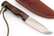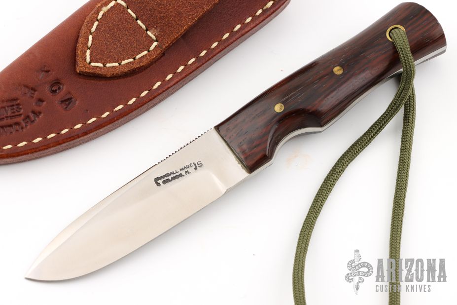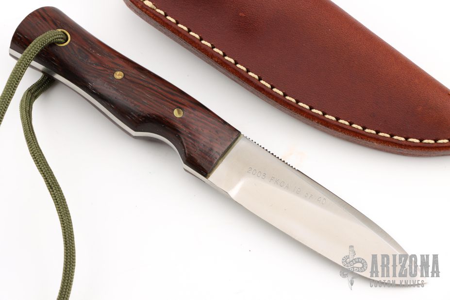 This Model 10-3 by Randall Made Knives features a satin finished blade with notched thumbrest, .114" blade stock and .878" blade depth, full tang construction. The handle has cocobolo scales with brass pins. Numbered 19 of 40, made in 2003 for the Florida Knife Collectors Association. Comes with matching brown leather sheath, original paper wrapping and a Randall zippered case. Excellent condition.