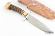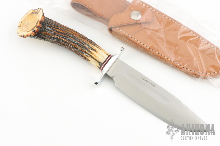The Teddy is made from 3/16" A2 high-carbon tool steel with an 1 3/8" depth. The double guard is 6061 aircraft aluminum and the handle is crown India stag with black/red spacers. The stag is large but comfortable and the blade is marked "1st Production Run".