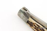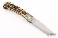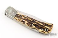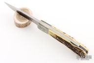 This Lockback by Bill King features a hand rub satin finished blade with nail nick. The handle has dovetailed, engraved, nickel silver bolsters, stag scales, nickel silver liners and steel lockbar and black linen micarta backspacers. Has a few very light scratches, otherwise excellent condition. #0354