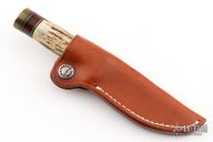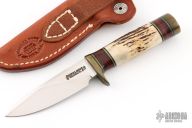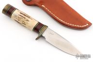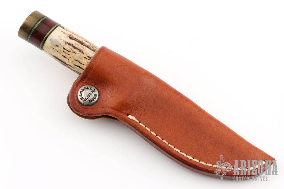 This is a RARE Model 25 Mini by Randall Made Knives, it is #989 of only 1500 made by Randall between 1996 and 1998. Identical to the standard Model 25 but scaled down. Has a drop point blade with false top edge, notched thumbrest, .172" blade stock and .871" blade depth, hidden tang construction. The handle has a brass guard and butt with a stacked leather and stag handle, black and brass spacers. Comes with brown leather sheath and a Randall zippered case. Excellent condition.