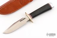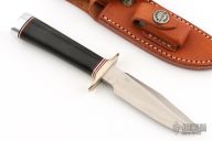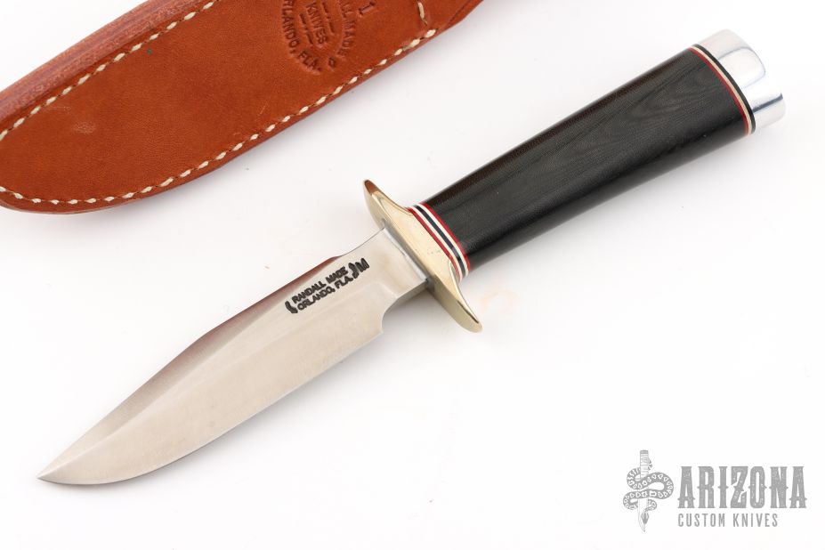 This is a miniature Model 1 - with all the features of the famous WWII full size Model 1. Stainless steel blade with top edge sharpened approximately 1 3/4 inches back from the tip, .170" blade stock and .845" blade depth, hidden tang construction. The handle has a nickel silver double guard, duralumin butt, and a black linen micarta grip with red/white/blue spacers. Comes with a brown leather sheath. In addition, the knife is authenticated by a coded transponder which cannot be altered. The transponder is inserted into the handle during construction with an encoded serial number matching the etched number on the blade. Only 1500 made. Serial number 257. Excellent condition. Comes with a Randall zippered case.