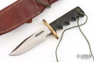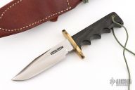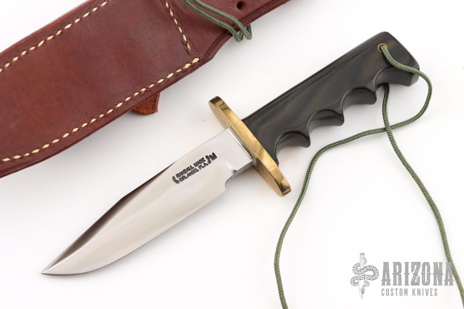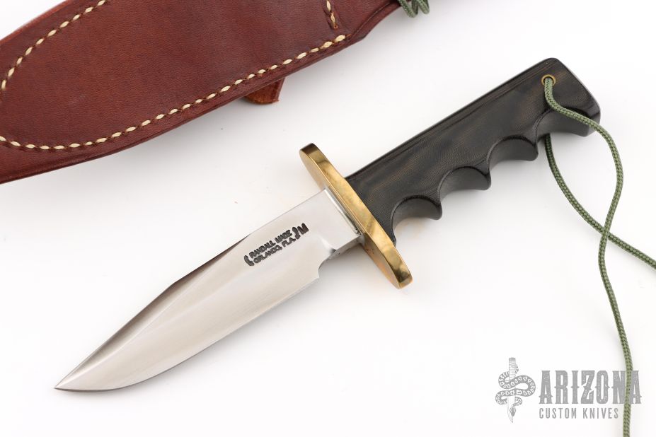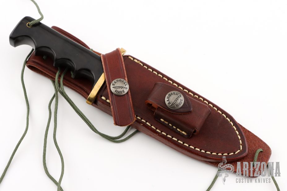 This is a miniature version of Randall's Model 14 Attack. The Model 14 was designed to meet the demand for an almost indestructible all-purpose knife, though it is especially suited for combat and survival purposes. #1092. Satin finished blade with sharpened top edge, .169" blade stock and .844" blade depth, full tang construction. The handle has a brass guard and black linen micarta grip, lanyard hole at the butt. Comes with original brown leather sheath and Randall zippered case. Excellent Condition.