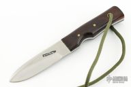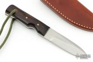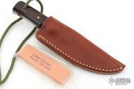 This Model 10-3 by Randall Made Knives features a satin finished blade with notched thumbrest, .114" blade stock and .850" blade depth, full tang construction. The handle has cocobolo scales with brass pins. Numbered 30 of 40, made in 2003 for the Florida Knife Collectors Association. Comes with matching brown leather sheath and a Randall zippered case. Excellent condition.