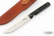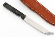 This Model 10-5 by Randall Made Knives features a satin finished blade with notched thumbrest, .094" blade stock and .817" blade depth, full tang construction. The handle has black linen micarta scales with brass pins. Numbered 31 of 40, made for the Florida Knife Collectors Association. Comes with matching brown leather sheath. Excellent condition.