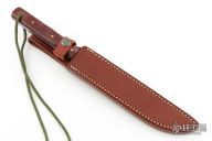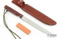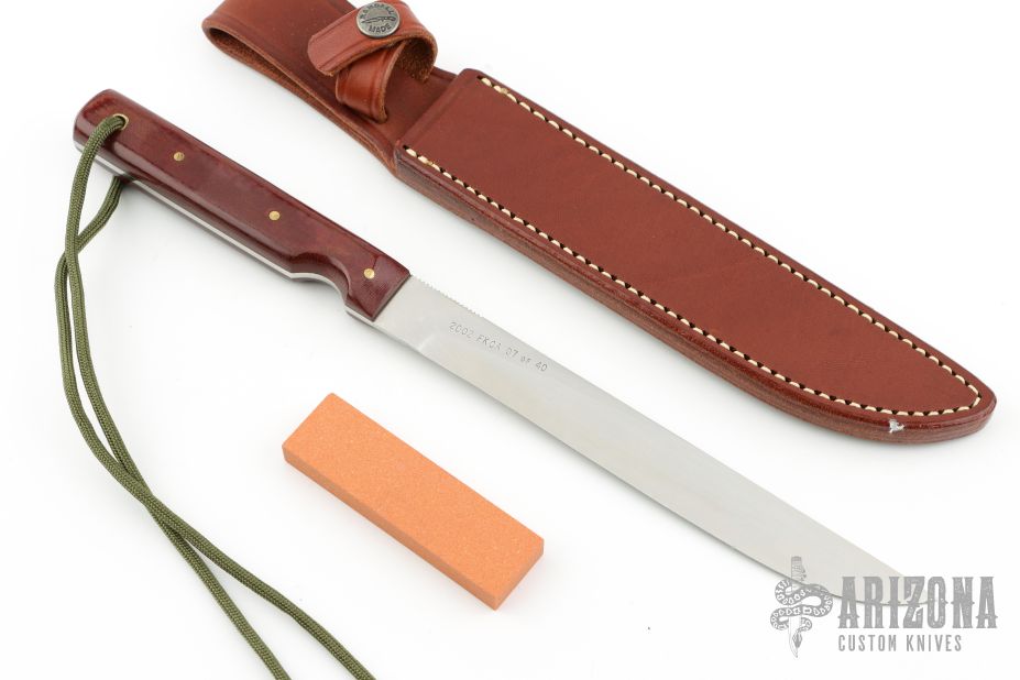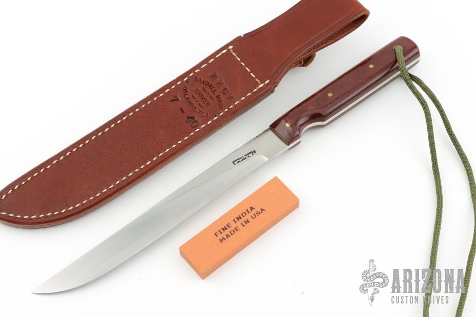 This Model 10-7 by Randall Made Knives features a satin finished blade with notched thumbrest, .111" blade stock and .792" blade depth, full tang construction. The handle has red linen micarta scales with brass pins. Numbered 07 of 40, made for the 2002 Florida Knife Collectors Association. Comes with matching brown leather sheath, zippered case and original paper wrapping. Excellent condition.