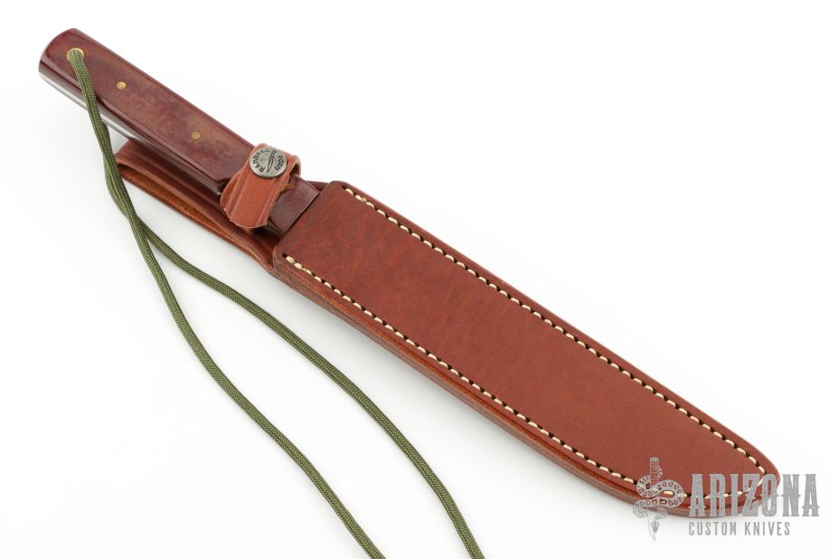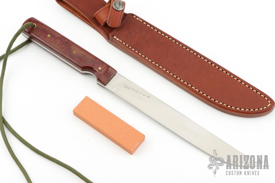 This Model 10-7 by Randall Made Knives features a satin finished blade with notched thumbrest, .114" blade stock and .875" blade depth, full tang construction. The handle has red linen micarta scales with brass pins. Numbered 17 of 40, made for the 2002 Florida Knife Collectors Association. Comes with matching brown leather sheath, zippered case and original paper wrapping. Excellent condition.