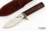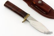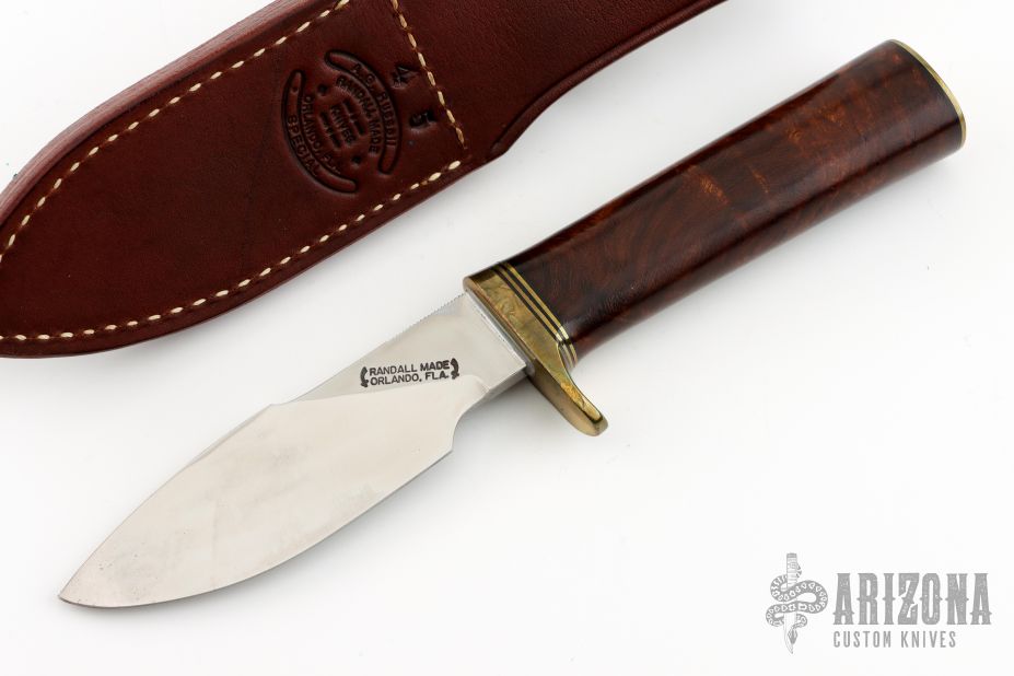 This A.G. Russell Special by Randall Made Knives has a satin finished blade with notched thumbrest, .207" blade stock and 1.326" blade depth, hidden tang construction. The handle has a brass guard and butt plate, desert ironwood grip, black and brass spacers. Numbered 55 on blade spine. Excellent condition. Comes with a brown leather sheath and a Randall zippered case.