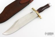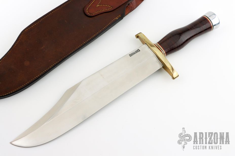 This Model 12-11 Smithsonian Bowie by Randall Made Knives features a satin finished carbon steel blade with sharpened top edge, .326" blade stock and 2.418" blade depth, hidden tang construction. The handle has a lugged brass guard and duralumin butt with brass tang screw, stacked leather grip with red/white/blue spacers. Comes with a brown leather HH Heiser brown button sheath. Comes with a zippered case. This knife is from 1953-1957. Excellent condition.