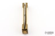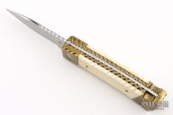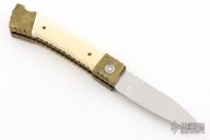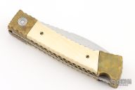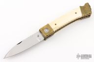 This slip joint features polished blade with nail nick and file work on the blade spine. The handle has a thick brass frame, that has file work throughout, with bone inlays. File worked blade spine. Has patina on the brass, and a couple marks on the handle and blade. Great condition otherwise.
