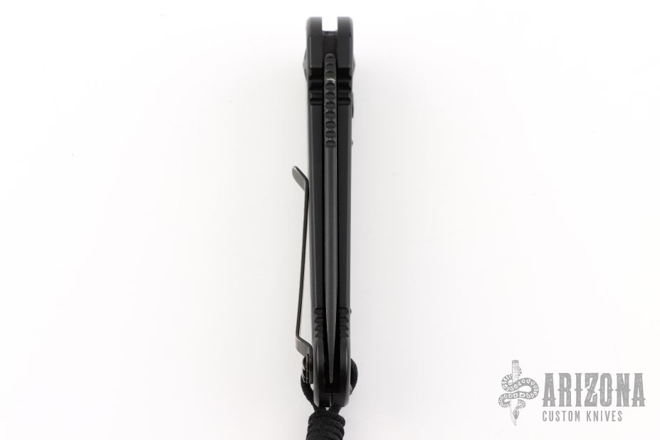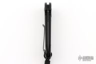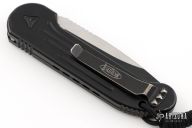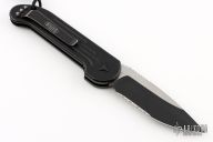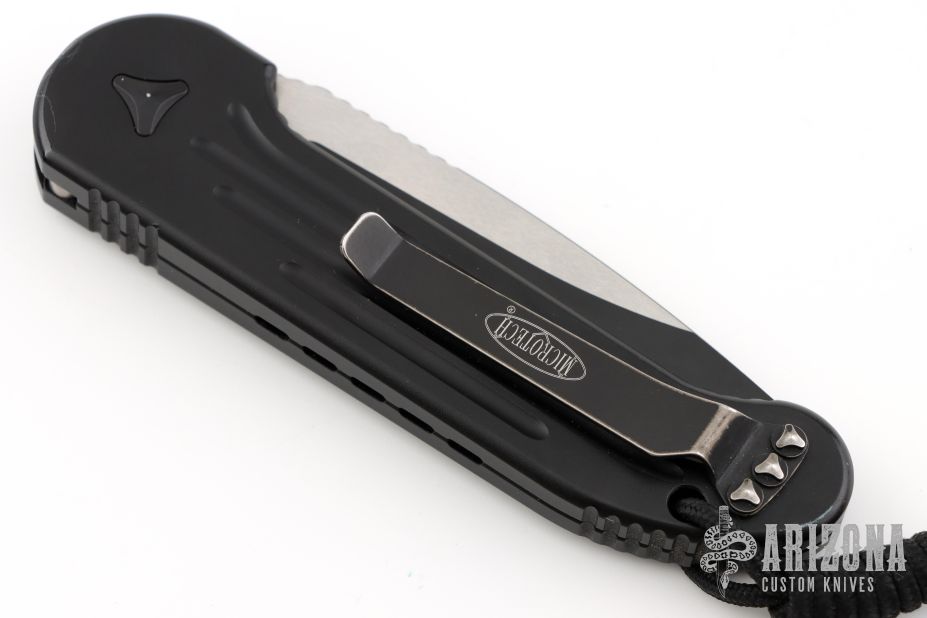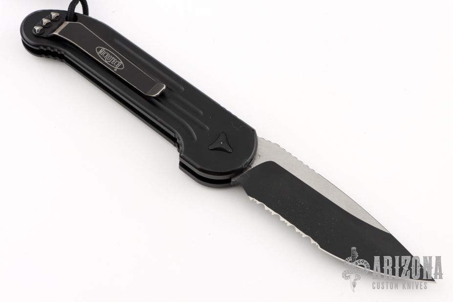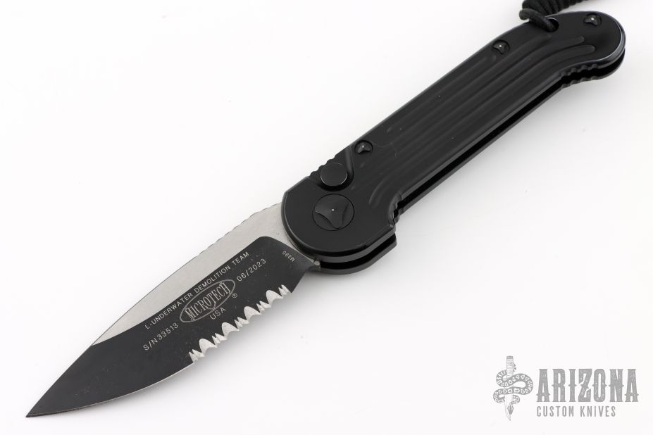 This LUDT side opening automatic by Microtech has a black blade with a partially serrated edge and a black aluminum frame. This tactical version has black fittings. Stainless steel clip. Dated 06/2023 and serial number 33513. Comes with original box. Has a few light scuffs otherwise the knife is in Excellent Condition.