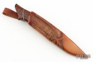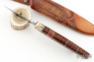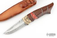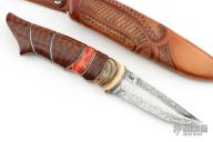 This knife titled "Red Snake" by Thomas and Claes Lofgren features a Mattias Styrefors multi-bar Mosaic Damascus blade with false top edge, .143" blade stock and 1.017" blade depth, hidden tang construction. The handle is made of stabilized fossil mammoth ivory, red apple coral, snakewood, black/silver spacers. Comes with a Scandinavian style hand tooled brown leather sheath and nylon zippered case. New from maker!