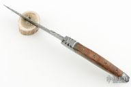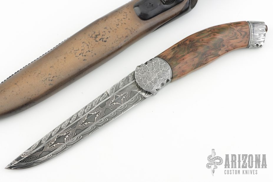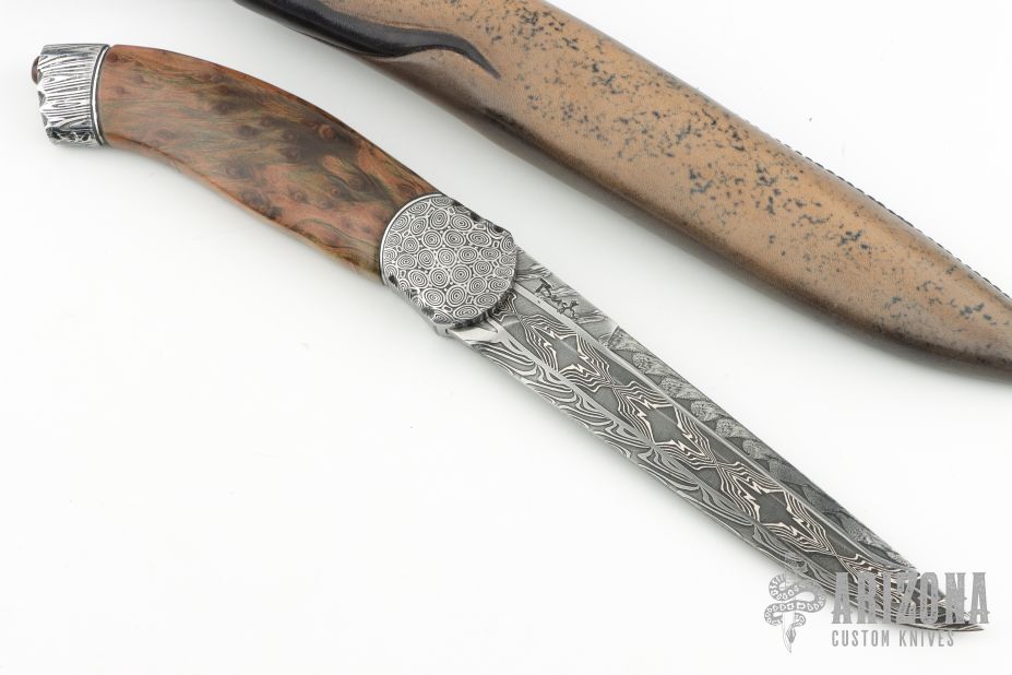 This knife titled "Sequoia Monument" by Thomas Lofgren features a Roger Bergh multi-bar Mosaic Damascus blade with false top edge, .185" blade stock and 1.139" blade depth, hidden tang construction. The handle has a "Bluetooth" Stainless Damascus guard and butt, redwood burl grip, black/silver spacers, small redwood cabochon in the butt, inlaid silver flowers in the spine. Comes with a Scandinavian style hand tooled leather sheath and nylon zippered case. New from maker!