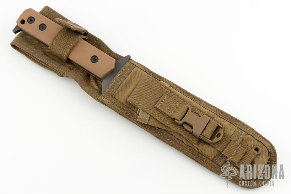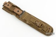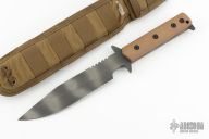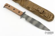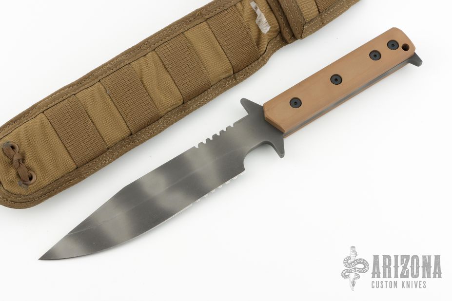 This D9 by Strider features a tiger stripe blade with serrations and a notched thumbrest, .248" blade stock and 1.530" blade depth, Integrated double guard with coyote brown G-10 scales. The blade has some light scuffs and scratches, otherwise excellent condition. Comes with nylon sheath.