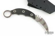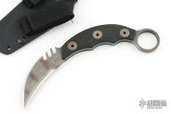 The HS Karambit is a collaboration design with Steve Tarani. Has a tiger striped double-edged hawkbill blade, .183" blade thickness and 1.015" blade depth. Sharpened top edge. Has black G-10 scales. There are light sheath marks on the blade, otherwise excellent condition. Comes with kydex sheath.