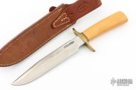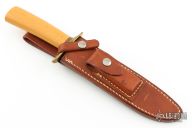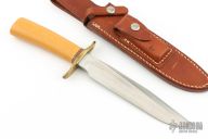 The Model 1 was made famous by Allied combat troops in World War II and has since been widely used in all theaters of war. It has .215" blade stock and 1.188" blade depth, satin finish blade with sharpened top edge, hidden tang construction. The handle has a nickel silver guard, vintage yellow paper micarta grip, and lanyard hole in the butt. Comes with Roughback brown leather sheath. Has a couple light spots on the blade, excellent condition otherwise.