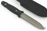 This Dagger by Allen Elishewitz features a double edged San Mai Damascus blade, .155" blade stock and 1.102" blade depth, hidden tang construction. The handle has a black G-10 grip with lanyard hole. Comes with a black leather sheath. Excellent condition.