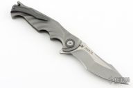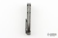 This Integral Tighe Breaker flipper by Brian Tighe and Friends features a two-tone blade with notched thumbrest and flipper. The handle has a blasted integral titanium frame with darkened titanium pivot collars, lanyard hole, tip up darkened titanium clip. Has some light scuffs, otherwise excellent condition. S/N 002