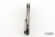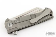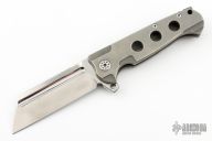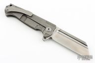 This ADV Classic Butcher framelock flipper has a satin finished blade with false top edge, fuller and notched thumbrest and flipper. Has a two-tone titanium frame, tumbled titanium backspacer, and titanium tip up clip. Nice detent, lockup and blade seating. Has some scuffs and scratches, otherwise good condition.