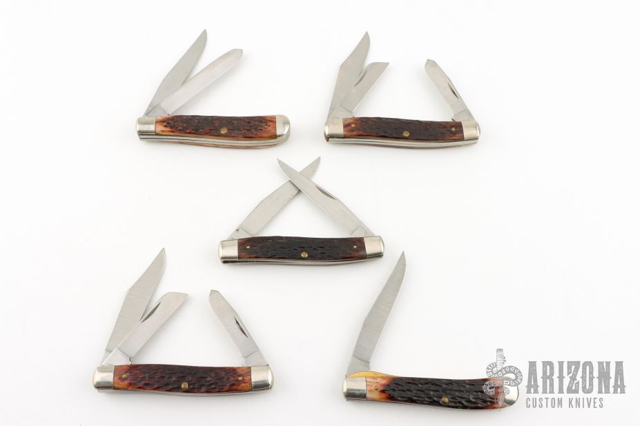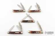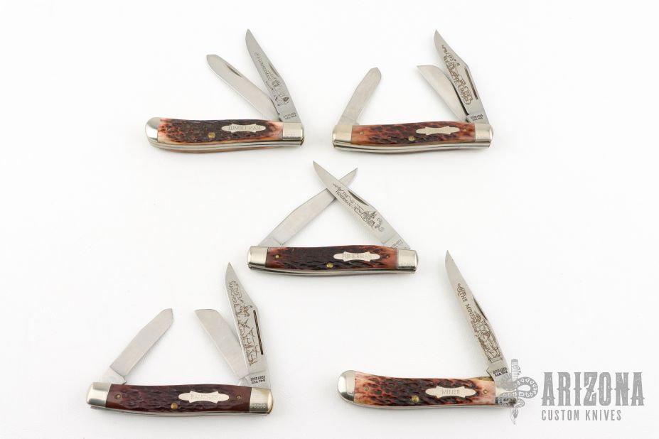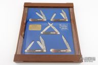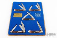 1981 framed, limited edition, display with five knives from the Schrade "Cutlery Classics" Tradesmen series. Serial number #B0630 stamped onto each knife. Includes Lumberman, Rancher, Fisherman, Farmer, and Miner. Display frame is solid cherry with flocked tray insert and acrylic cover. The knives are in excellent/unused condition.