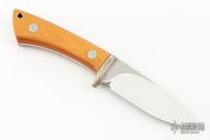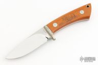 This hunter by Richard "HUK" Plantis features a mirror polished blade with .212" blade stock and 1.215" blade depth, full tapered tang construction. The handle has an engraved nickel silver guard and pins, yellow paper micarta scales with red liners. The front scale has scrimshaw of a bear with a salmon in its mouth signed Selvidge and dated 1976. Excellent condition. Comes with a wooden presentation box.