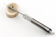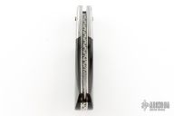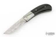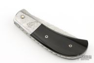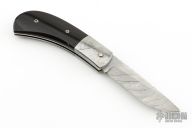This scale release auto from A.A. Sanders features a Damascus drop point blade with file worked spine. The handle has dovetailed Damascus bolsters and buffalo horn scales, over stainless steel liners and file worked backspacer. Strong spring action. Has some patina, and some scratches, great condition otherwise.