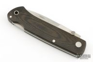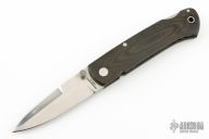 This Lockback Folder by Phil Boguszewski features a hand rubbed satin finished blade with false top edge and dual checkered thumbstuds. The handle has black linen micarta scales, stainless steel backspacer, and a lanyard hole at the butt. Has some scuffs and scratches on the handle, and a couple scuffs on the blade. Great condition otherwise.